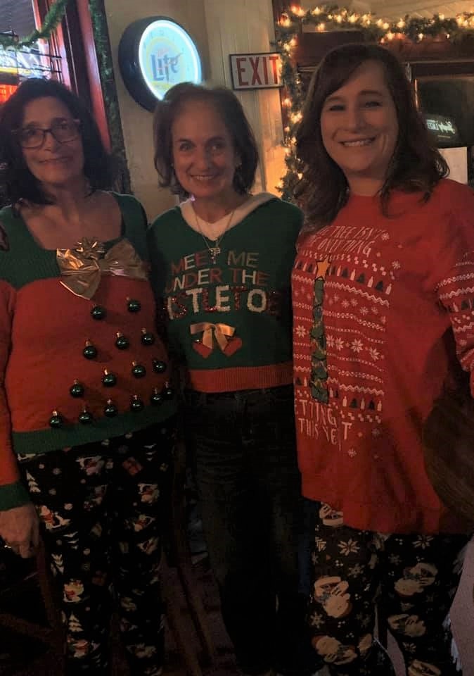 Deb, me, & the beautiful Ms. Mandi. Her Ugly Christmas sweater says, "The Christmas tree isn't the only thing getting lit this year" and it lights up, too.