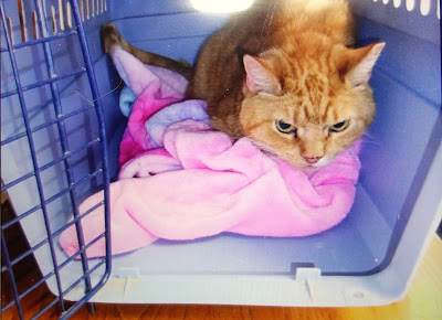 Well, on Monday Butterscotch had his follow-up appointment. It went well. Dr. Watska said he checked out and she saw no lumps or tumors on his left leg. She told us to remind her to check his leg every time Butterscotch has an appointment so that she may examine it. My husband usually drives and I keep him on my lap in his carrier so that I may calm him down, but this time I had to take him myself. Poor guy was so upset and would not stop crying until we got there.